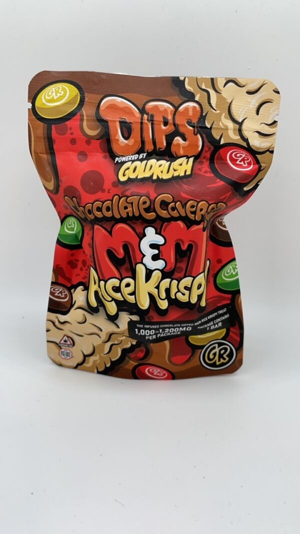 Crispy rice treat base. M&M candy pieces. Rich chocolate coating. THC infused. Fun playful edible. Sweet satisfying.